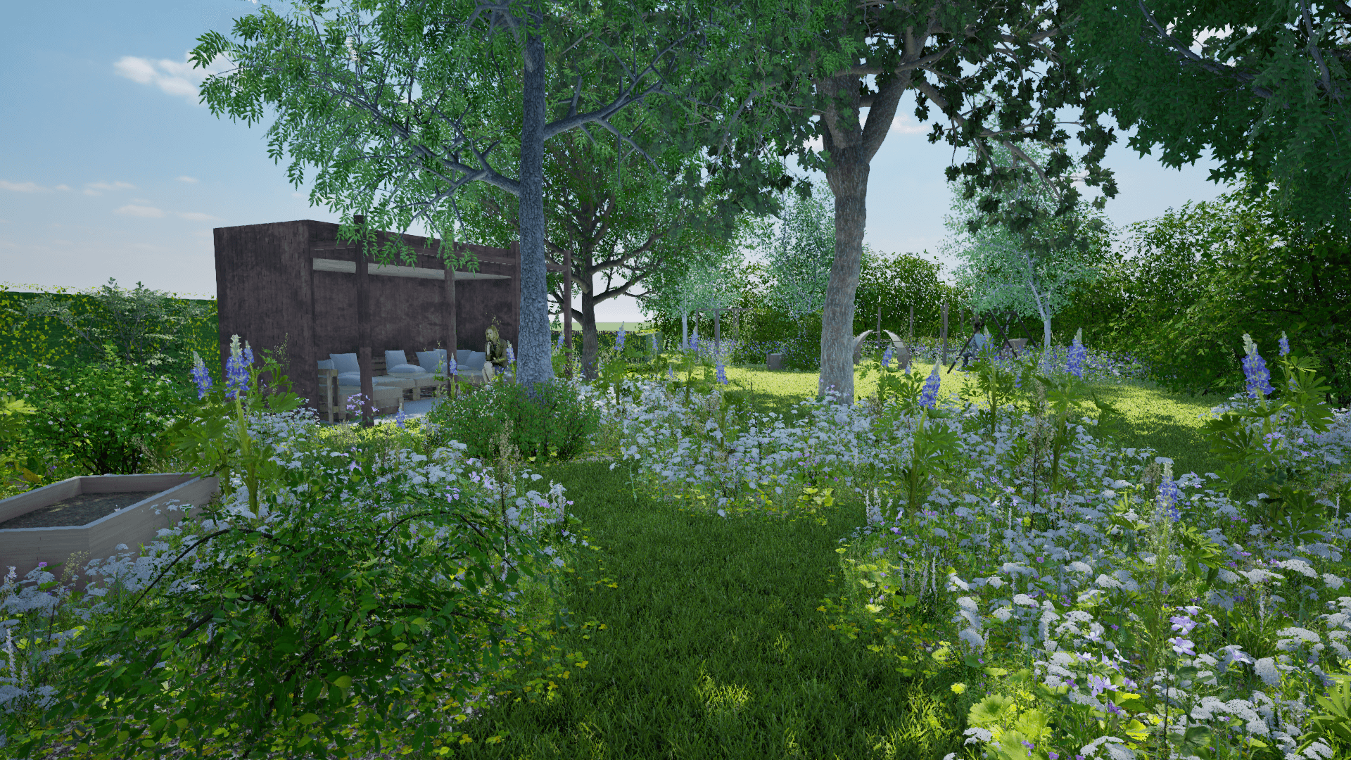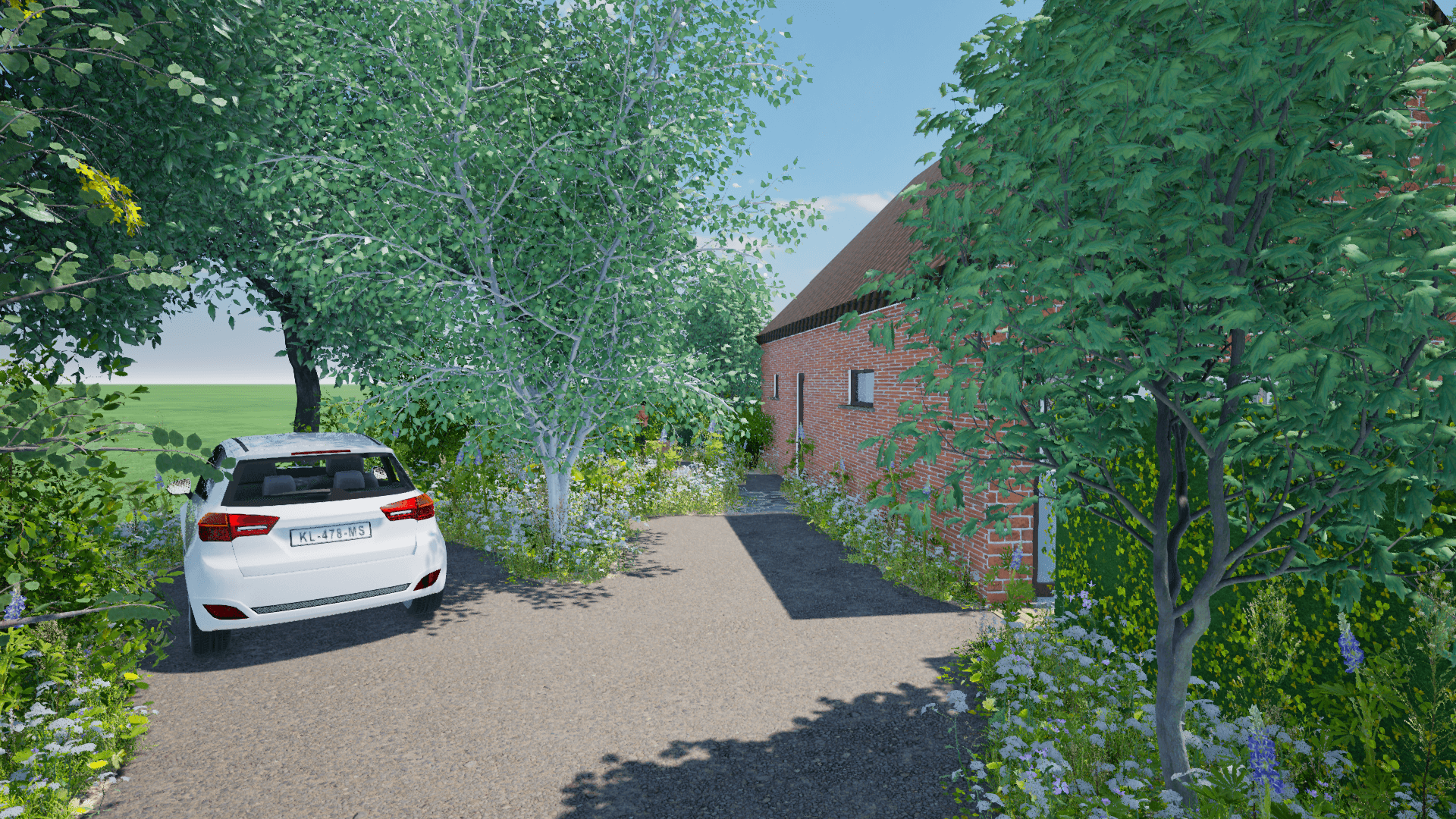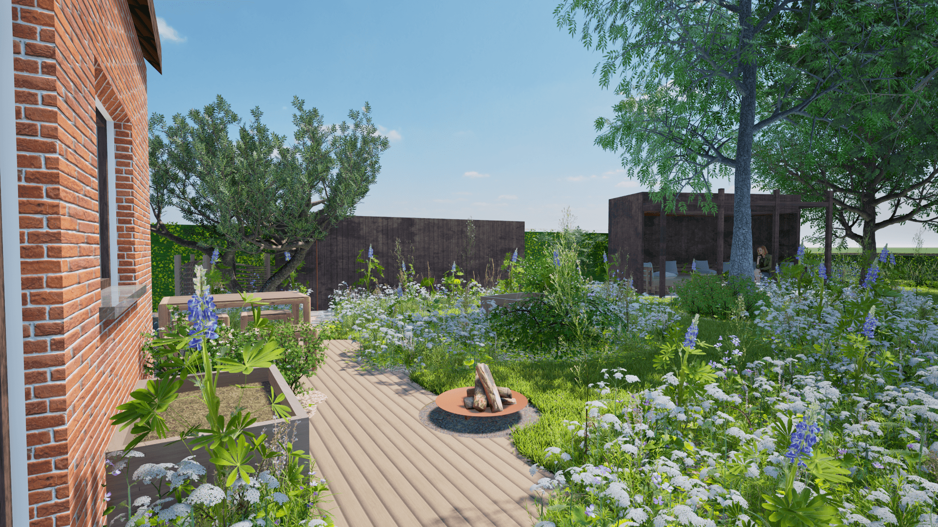 De wadi draagt bij aan een duurzaam waterbeheer, terwijl bloemrijk grasland en een takkenwal de biodiversiteit versterken. De keuze voor inheemse soorten en natuurlijke materialen zoals padoek, flagstones en grindverharding ondersteunt de ecologische visie van het ontwerp.