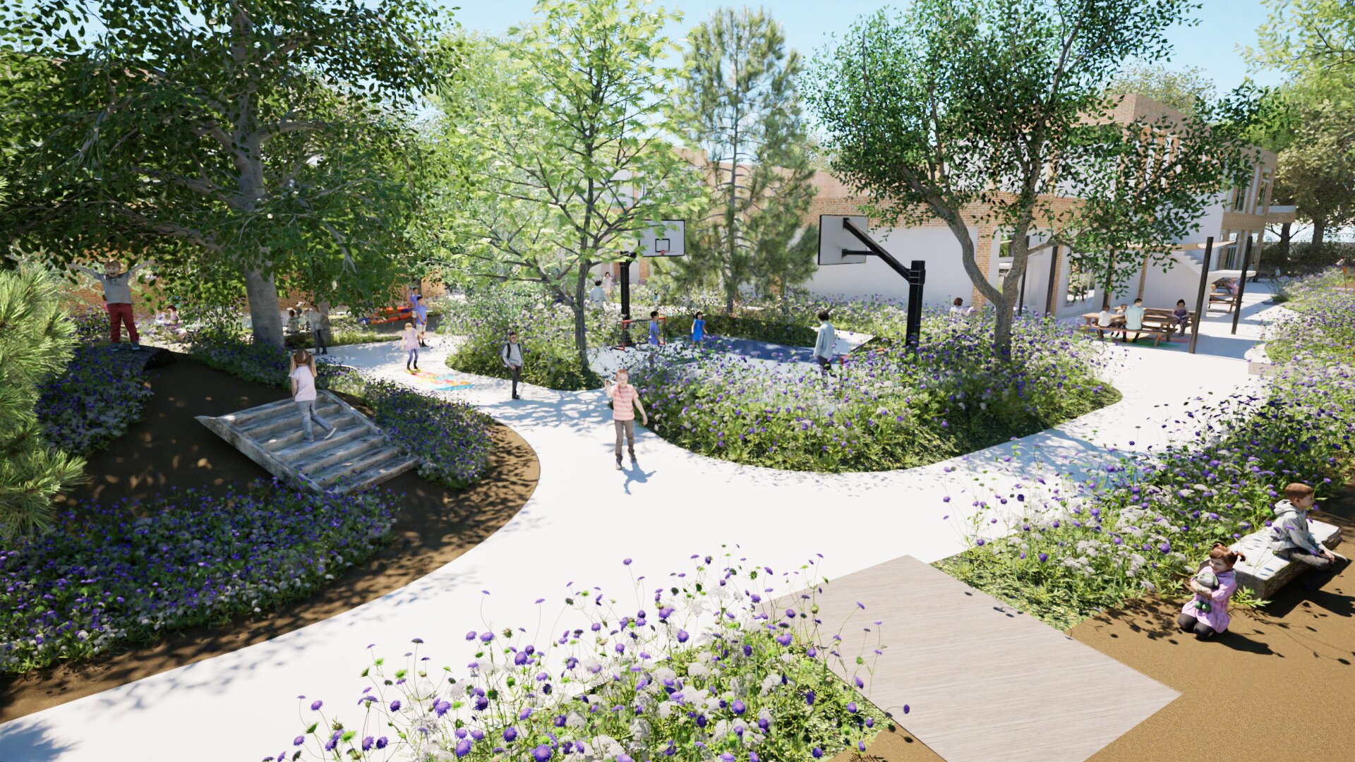 Vanuit de visie is de vergroening niet alleen functioneel, maar ook ecologisch doordacht. We werkten met inheemse beplanting, biodiverse zones, regenwateropvang via een wadi, en duurzame, onderhoudsvriendelijke materialen. De nieuwe speelplaats is klimaatadaptief en draagt bij aan de biodiversiteit op school.