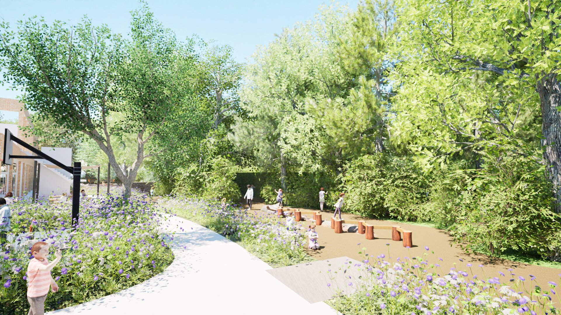 Voor School De Regenboog in Kessel, een school voor buitengewoon basisonderwijs, ontwierpen we een multifunctionele, vergroende speelplaats die inspeelt op de diverse noden van kinderen met een mentale beperking, fysieke beperking en/of gedragsstoornissen (type 2, 4 en 9). Het resultaat is een inclusieve, natuurlijke buitenruimte waar kinderen spelenderwijs kunnen ontdekken, bewegen en tot rust komen.
