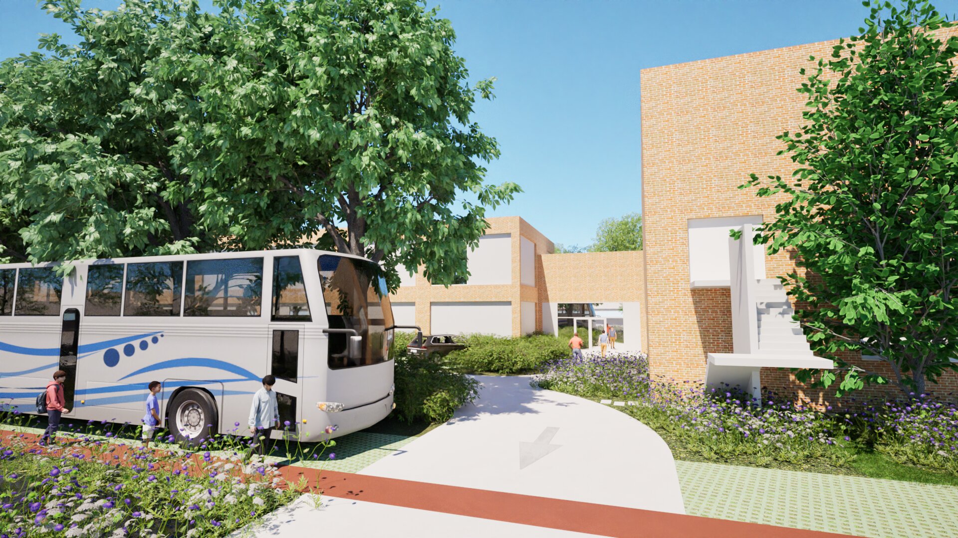 Het parkeerprobleem bij de school werd aangepakt via een nieuwe, overzichtelijke circulatie rond de inkomzone. We optimaliseerden de verkeersveiligheid voor zowel voetgangers als schoolvervoer en voorzagen extra beplanting om het geheel een zachtere en groenere uitstraling te geven.